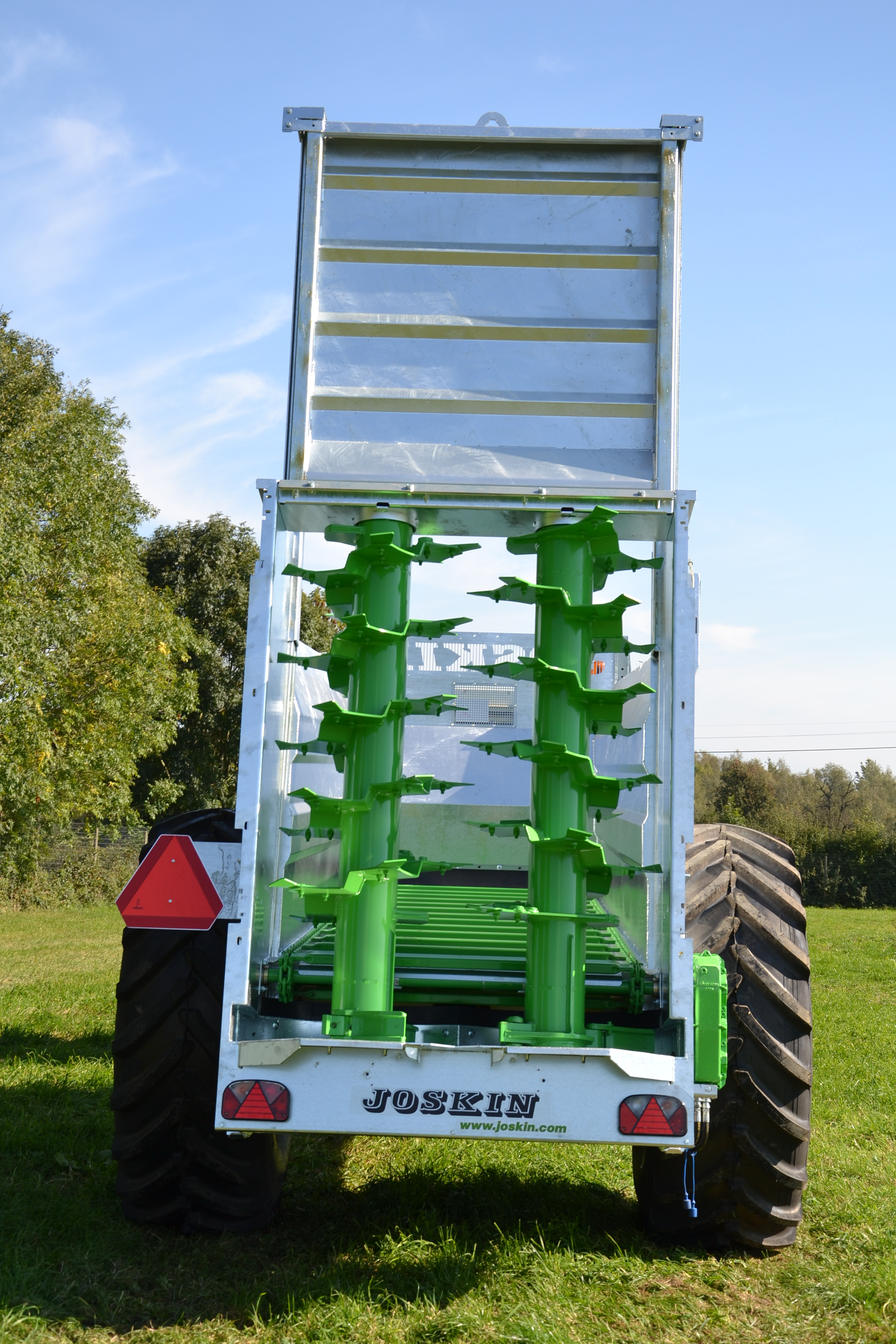 El esparcidor SIROKO JOSKIN, con caja rebajada, es notable por muchas razones, entre las cuales: su diseño innovador facilita considerablemente el mantenimiento de la máquina. La suspensión transversal de la lanza y la gran dimensión de las ruedas le procuran una excelente estabilidad durante el trabajo y el transporte sobre ruta. Su caja en acero HLE 550 alta resistencia formada por pliegues sucesivos dispone de un borde superior rectangular. La altura de los flancos de 1090 mm. o 1.340 mm ofrece una capacidad de carga de 6,44 m³ hasta 14,17 m³. Según el producto, los dos cilindros con espiras plegadas desmenuzan y proyectan a una distancia de 7 hasta 10 mts. por pasaje.